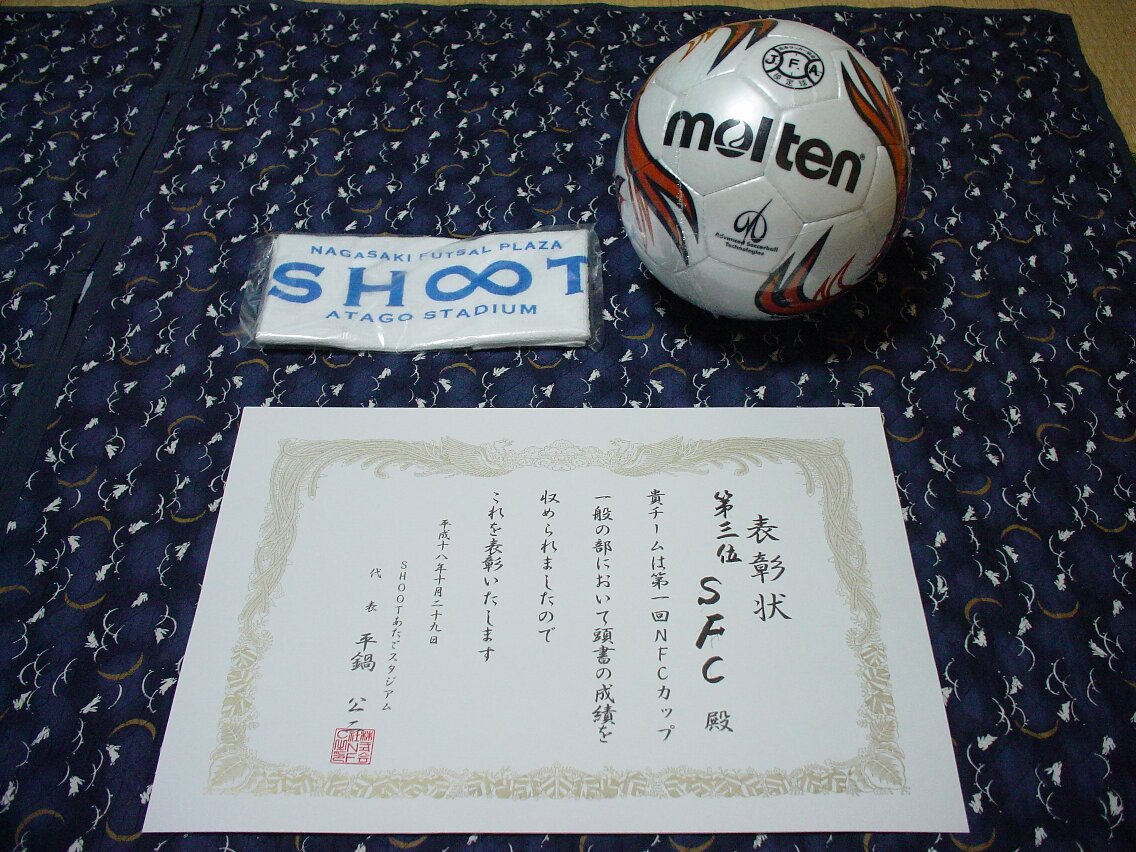 | 左上:参加賞のタオル 右上:一般の部3位の副賞(フットサルボール) 下:賞状(一般の部3位) |